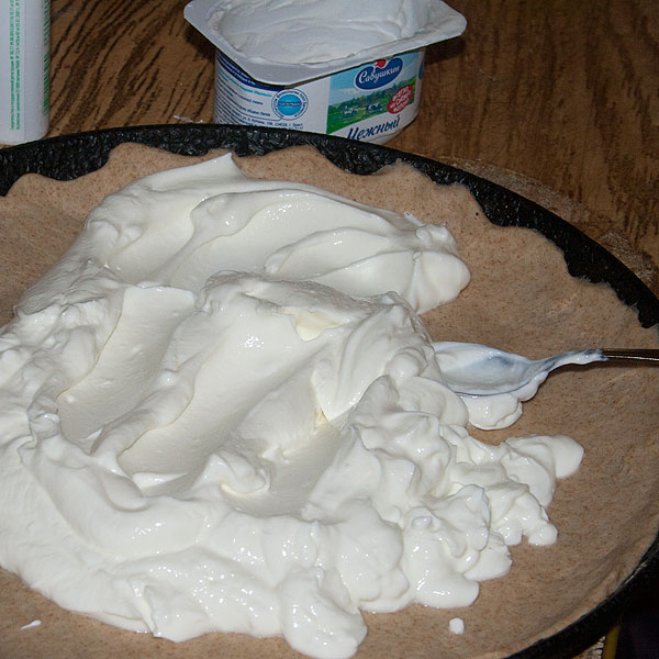 Творог у меня без крупинок, нежный. У меня он без сахара, поэтому я его подслащаю (на 1 баночку 125 гр – 1 столовая ложка сахара). Можно взять творожок уже подслащенный и с кусочками фруктов. Можно заменить такой творог на творог, смешанный со сметаной в пропорции 1 к 1. Можно заменить на филадельфию, маскарпоне, рикотту.