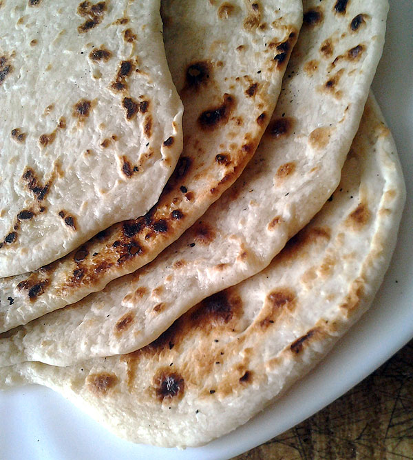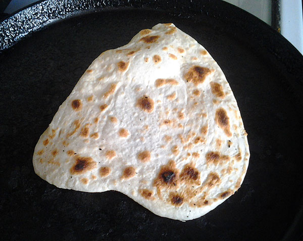 Я раскатываю 2-3 лепешки и зажигаю огонь под сковородкой. Сковородка должна быть чистая, сухая, ее ничем не смазываем. Потом раскатываю еще одну – и выкладываю одну лепешку на сковороду. Тем временем раскатываю следующую. Когда лепешка начинает на сковородке пузыриться, ее можно переворачивать. Вот примерно такое состояние, лепешка меняет цвет не равномерно, а такими подпалинами.