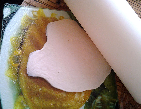 Пельменное тесто раскатать как можно тоньше. Можно до такой толщины, чтобы тесто просвечивало. Раскатать лепешку размером от компакт диска до величины вашей сковороды.