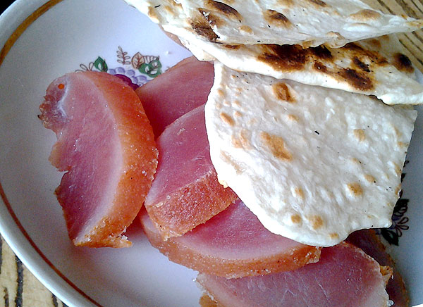А муж может потреблять такую лепешку, скажем, с гуляшом, бефстрогановым. Или в виде бутера с котлетой. Да и вообще с любым мясом вкусно. Но не только с мясом, можно и в варенье макать.