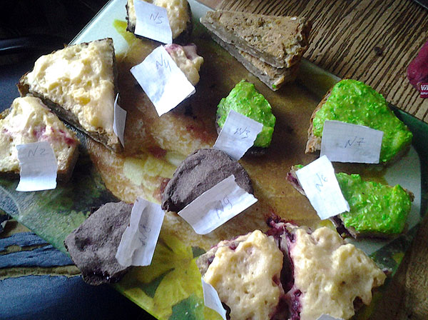 На матфаке полным ходом близятся празднования Дня Математика. У меня есть обязанность -- к Аукциону испечь торт. В этом году придумала, что надо испечь торт с одним ограничением. Пытаюсь найти идеальный рецепт. Вот -- пробы пера. 3 разных рецептов для коржа, 6 разных вариантов для крема. Всего 10 образцов -- домашним предлагала выбрать лучший.