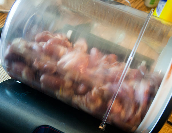 Сердечки с маринадом запустила в маринаторе на 2 раза (на 18 минут). Вставку шипастую (для “отбивания” мяса) не вынимала. Вот это, крутится. У кого нет маринатора, можно оставить в холодильнике на ночь.