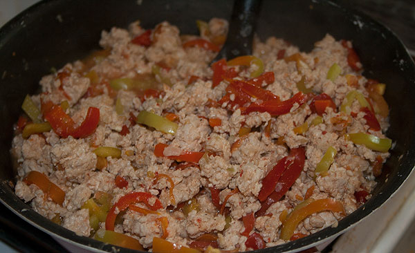 Из лука-морковки сделать зажарку. Добавить сюда фарш, обжаривать, пока фарш не поменяет цвет. Посолить, поперчить, добавить остальные овощи. Жарить-жарить.