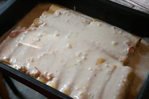 Заливаем соусом бешамель. У меня соуса на фотографии мало (было маловато молока). Обязательно следите, чтобы весь верх был покрыт соусом.