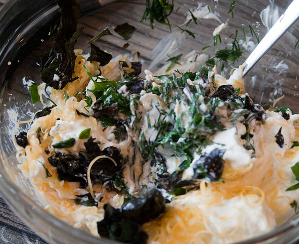 Творог + травы + тертый сыр в произвольной пропорции. В качестве творога может быть рикотта. У меня – мягкий творожок. Люблю мягкий, без крупинок. Но и из обычного творога с крупинками выходит чудесно.