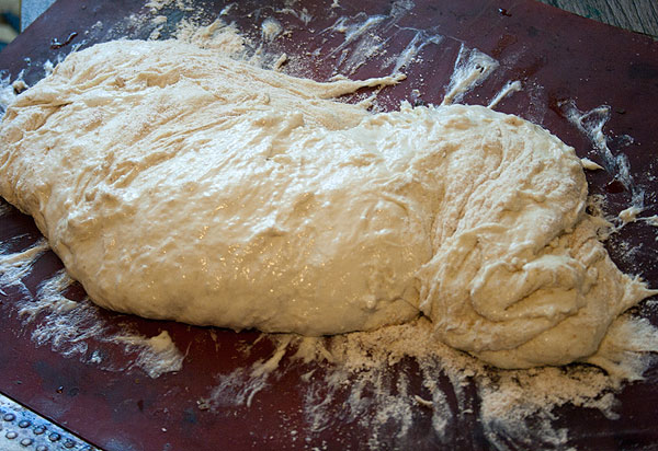 Тесто очень-очень липкое и жидковатое. Это не страшно. В самом конце тесто припорошить мукой и оставить отдыхать часа на полтора. За это время оно подойдет, увеличится в размере и станет более однородным и гладким.
