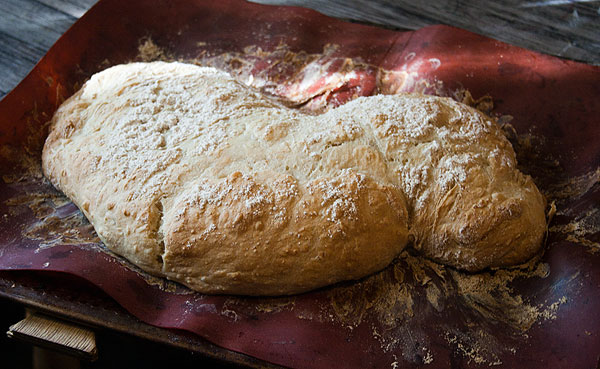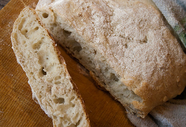 У хлеба изумительная хрустящая корка и крупные дырки. Совершенно чудесен хлеб с плавленным сыром, с малосольной семгой или с вареньем. Очень простой в приготовлении. Очень простой, и оттого еще более хороший, вкус.