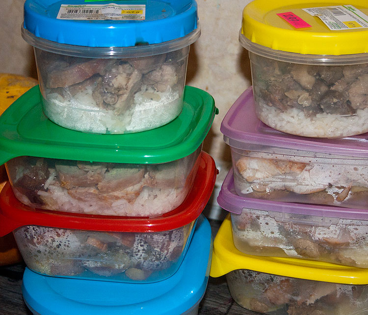 Процесс можно организовать двумя способами. Первый – самый простой. Хотим готовить, готовим много. Например, большой казан плова. Не дожидаясь, пока он всем надоест, а пока он еще свежий (но уже остыл) – фасуем его по одной порции в контейнер.