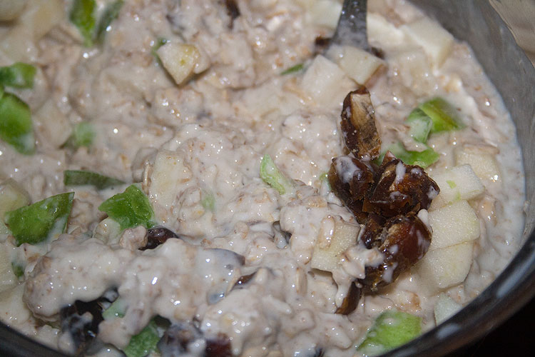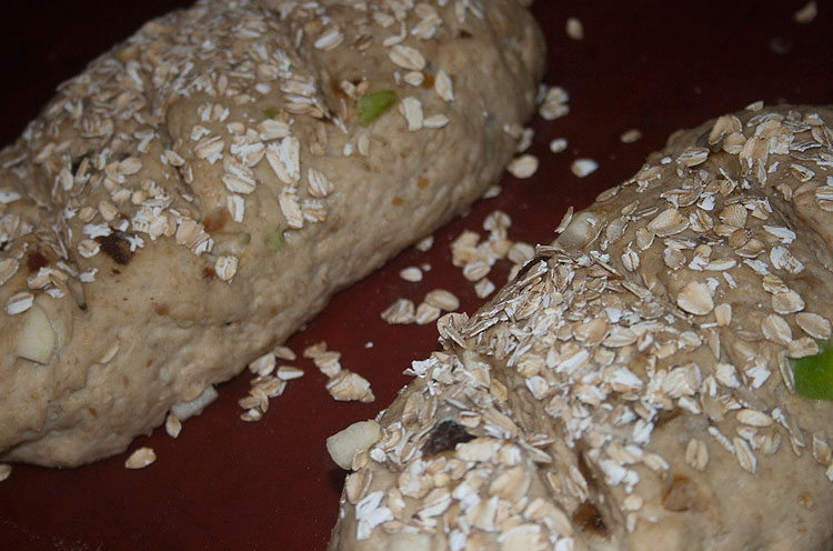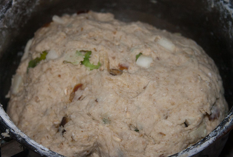 1½ стакана горячей воды /*я взяла 320 грамм теплой воды -- в горячей дрожжи растворять побоялась */ 2¼ чайной ложки сухих дрожжей /*9 грамм*/ 2 столовые ложки меда /*заменила, т.к. мед не люблю страшно, хоть и понятно, что по феншую нужен мед )*/ 1½ стакана овсяных хлопьев не быстрого приготовления /*150 грамм*/ 2½— 3 стакана пшеничной муки (можете добавить овсяной муки) плюс еще немного по необходимости /*У меня ушло полстакана (60 грамм) овсяной муки плюс почти 3 стакана (340 грамм) пшеничной муки*/ 1 столовая ложка крупной соли /*20 грамм*/ 2 столовые ложки размягченного сливочного масла /*Я пропустила, но это 50 грамм*/ ⅓ стакана фиников, нарезанных кубиками /*Примерко 80 грамм*/ ⅓ стакана нарезанных кубиками апельсиновых цукатов /*Апельсиновых цукатов в продаже не встретила, заменила наиболее похожим на них чем нашла -- цукатами из помело. На картинке выше они зеленые, их меньше, чем фиников и яблок -- 50 грамм. */ ⅓ стакана очищенного и нарезанного кубиками яблока /*75 грамм*/ овсяные хлопья для посыпки (по желанию) /*Я желала )*/