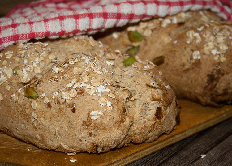 Овсяные хлопья делают этот нежный и вкусный хлеб сытным, но позволяют ему остаться легким. Каждый ломтик отличается сочетанием разных кусочков фруктовой начинки. Кусочки, где попадаются цукаты, ну очень сладкие, просто чудесные – хочется откусить еще и еще.