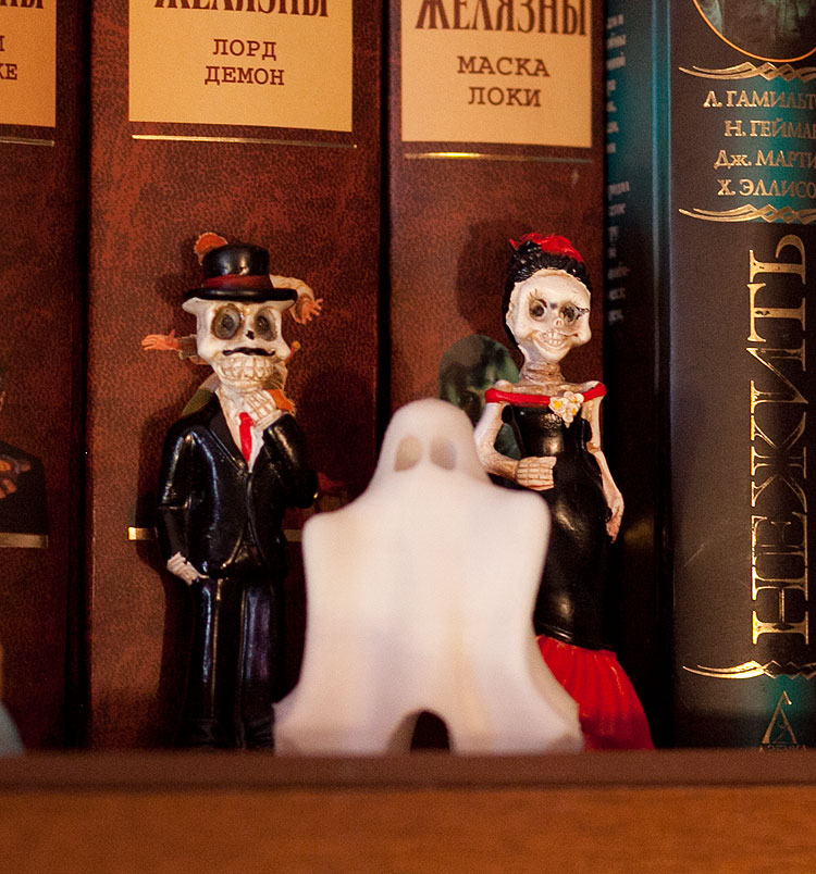 Так уж вышло, что в какой-то момент было очень сложно удержаться и появились еще вот эти, хэллоуинские жители. Ну, практически Дед Мороз со Снегурочкой и Снеговичок загробного мира. Конечно, эти жители уже не проходят по статье “новогодние” и я еще не решила, поедут ли они на антресоли, когда буду убирать елку.