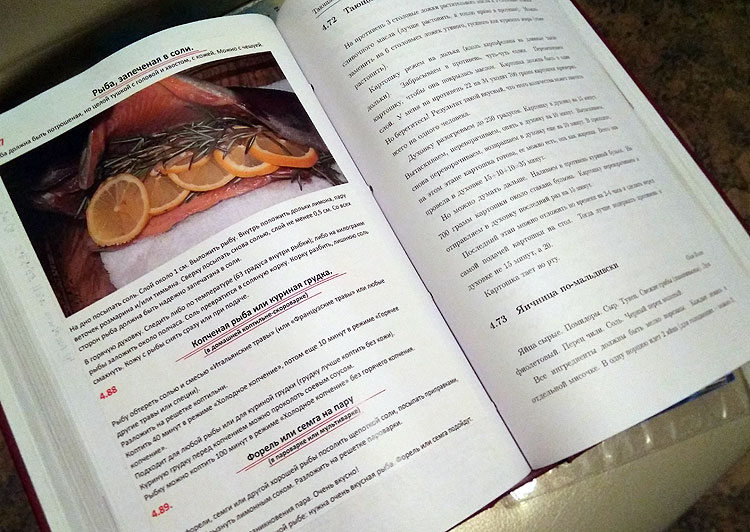 У меня, конечно, есть и нормальные кулинарные книги. Но я к книгам отношусь с трепетом – и никогда их на кухню не понесу, а тем более мокрыми руками во время готовки трогать не буду. А эта книга специальная, ее не жалко носить на кухню – у нее предназначение такое!