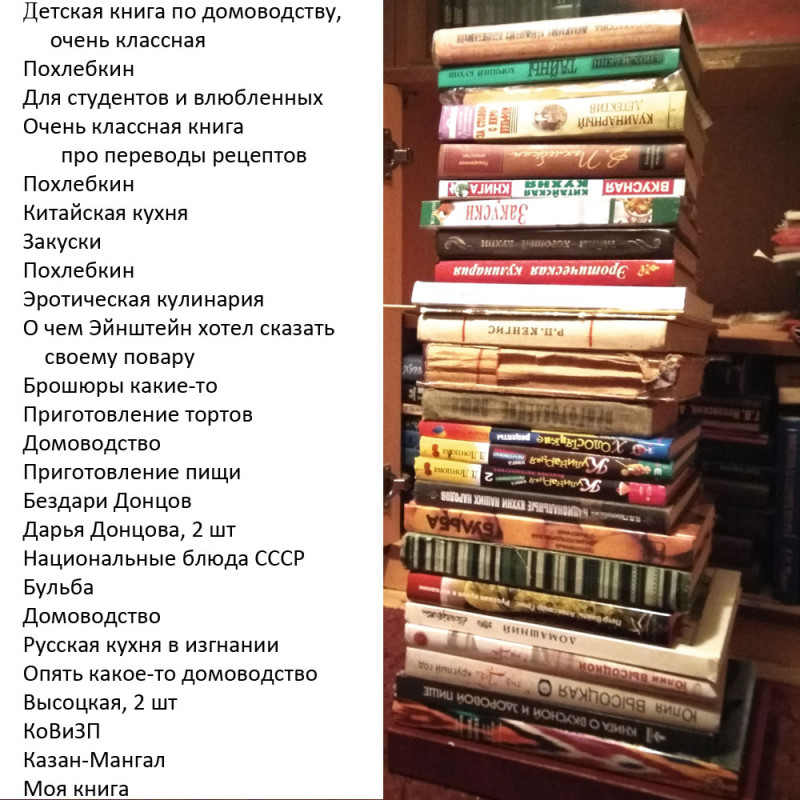 (вот я выложила из шкафа кулинарные книги, какие у меня набрались. Некоторые из них бестолковые. Некоторые очень известные и так. Про некоторые писала по тегу “кулинарные книги”)