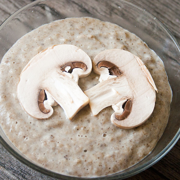 В принципе, можно и в таком виде, наверное, есть. Но я погрузила в это безобразие блендер и хорошенько все пробила блендером. Для украшения – свежие шампиньоны. Их можно съесть )