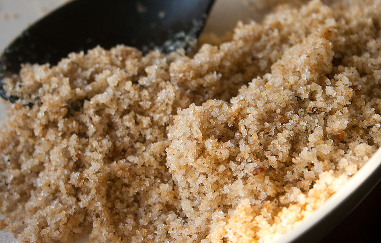Взять 50 грамм панировочных сухарей (3 столовые ложки) и 75 грамм сахара. Обжарить все это вместе в крошку в одной столовой ложке масла.