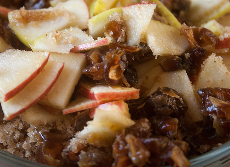Смешиваем в миске яблоки, финики в роли изюма (прямо с ромом, если он не впитался), сухарную крошку и сколько не жалко корицы.