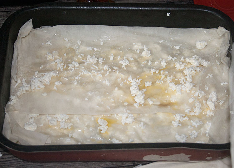Форму смазать маслом. Выложить лист теста. На лист теста насыпать/покрошить брынзу. Закрыть вторым листом. Далее лист теста – масло – сыр. Я смазывала маслом каждый второй лист. На вкус жирно не получается.