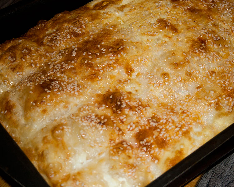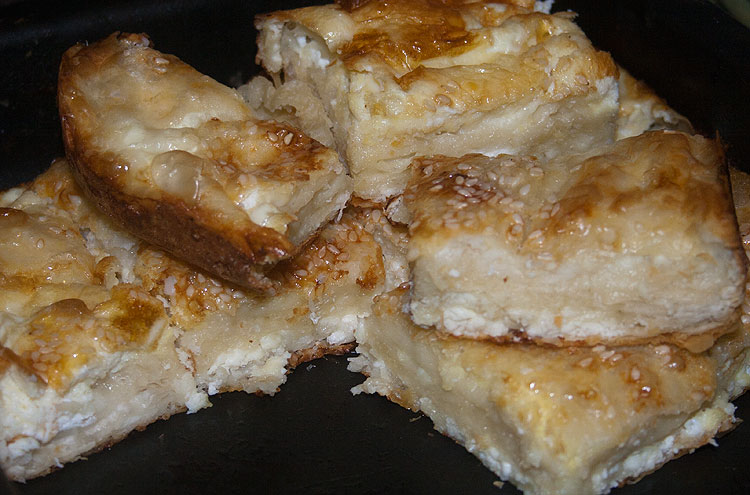 Выводы и впечатления: получилось очень вкусно. Не очень жирно (я этого опасалась). Солоноватость брынзы была в тему, но не знаю, понравилось бы мне, если бы весь сыр был соленым. В следующий раз сразу буду готовить из соленого и несоленого сыра пополам ) Творог тоже отлично вписался, вообще, отличить какая начинка лучше не удалось – все было очень однородно. Пирог отлично берется рукой, ничего никуда не падает и не капает. Удобно. С кунжутом красиво, но на вкусность он не влияет – можно брать, можно нет.