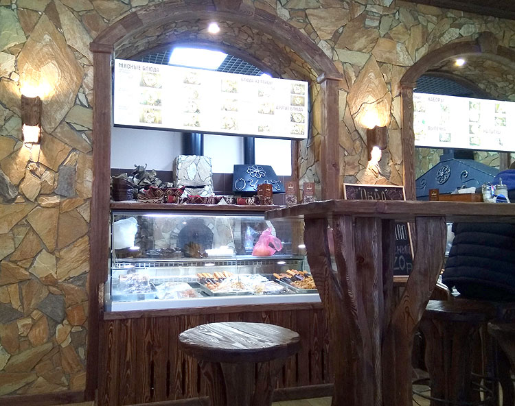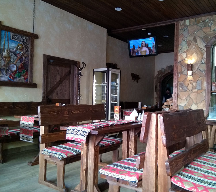 Мне очень нравится интерьер. Тут тяжелые деревянные столы со скамьями, накрытые скатертями в таком народном стиле.