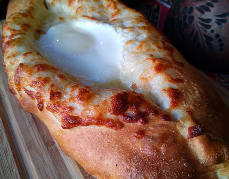 Очень вкусное (вкусный? вкусная?) здесь хачапури. Они, правда, раз за разом допускают одну и ту же ошибку – передерживают яйцо сверху, яйцо должно быть жидким, чтобы в него макать тесто. У них тут яйцо прихватилось. Но в остальном – одно из лучших хачапури по-аджарски в городе. И тесто очень вкусное, и начинка очень сбалансированная, и яйцо все-таки не вкрутую, т.е. в него получается макать тесто.