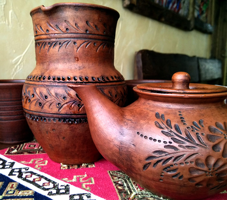 И очень крутая посуда из толстой глины. (Муж пьет тан из кувшина, я пью чай из чайника).