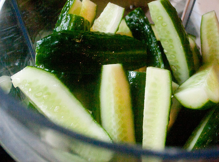 Нам понадобятся огурцы размером с ваш указательный палец. Если огурец такого размера, у него надо просто отрезать оба кончика. Если ваши огурцы крупнее, как достались мне в этот раз, порезать на четвертинки (или на куски такого размера, как ваш палец).