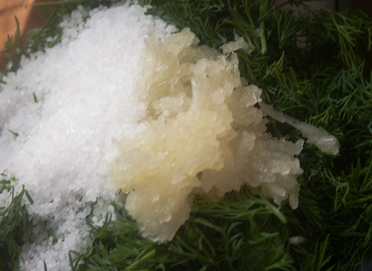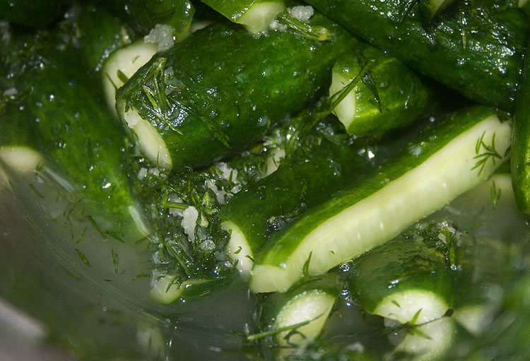Базовый набор всего остального тут тоже предельно прост. Нет никаких листьев вишни и стеблей хрена, которые такому городскому жителю, как я, довольно трудно найти. Кроме самих огурцов нам нужна соль, укроп и чеснок.