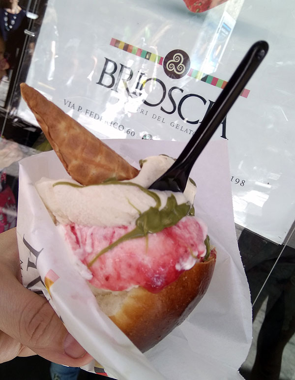 Местная сицилийская фишка – мороженое “бриоша”. Мороженое подают не в рожке, а в бриоше – сдобной булочке. Можно попросить в рожке, конечно, так тоже могут дать. Вот то, что на фото – это минимальная порция. Стоит 2,5 евро, тут 3 шарика мороженого на выбор, бриоша, 2 топинга и сверху втыкают рожок. И да, это вкусно. И бриоша (особенно тот кусочек теста, что успеет пропитаться растаявшим мороженым) тоже вкусно.