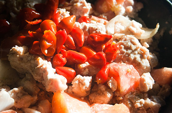 Короче. Для начинки я лук порезала крупно, бросила в сотейник обжариваться. Добавила фарш. Чуть позже добавила помидор. В самом конце добавила консервированные острые перцы (они нам как-то не очень понравились и муж предлагал их выкинуть, а по смыслу мне нужны были перцы болгарские, которых у меня было мало). Если у вас есть болгарские перцы в хорошем количестве, то это сюда подойдет даже лучше.