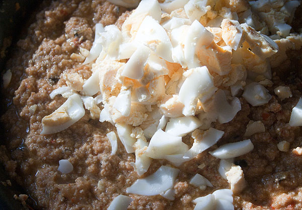 Итак, все овощи с мясом я пробила блендером до почти что однородной массы. И потом добавила вареное яйцо. Вообще, по-моему, на вкус оно не повлияло, так что можно пропустить, но в оригинале было.