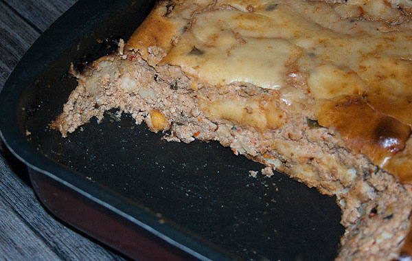 На 600 грамм фарша у меня была помидорка 600 грамм и остальных овощей, наверное, чуть больше, чем 600 грамм. В итоге начинка в пирог получилась намного более мясная, чем в оригинале! Надо мяса в 2 раза меньше брать, похоже ))) В остальном по вкусу очень похоже, только более острая.
