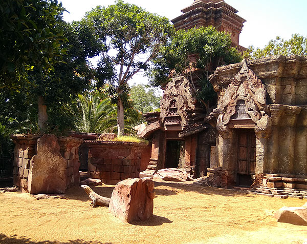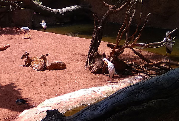 Все вольеры оформлены в каком-то сказочно-доисторическо-этническом духе. Огорожены кое-где стенами, кое-где водоемом (а потом зрители находятся на существенном возвышении). В некоторых местах стены стеклянные и животных можно увидеть просто в 10 сантиметрах от тебя, если они туда придут, конечно.