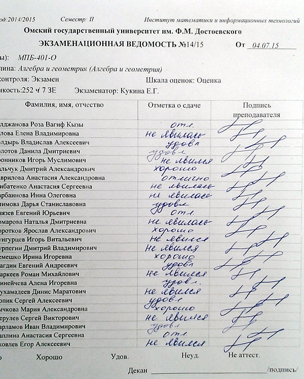 Хотя конкретно ведомость – это внутренний документ деканата, в ней вообще можно чиркаться, чертиков рисовать, и писать всякую ахинею. Если декан не против (или секретарь деканата – в некоторых случаях это круче декана). Поэтому даже бланк деканат может изменить. Скажем, ввести колонку “рейтинг”.