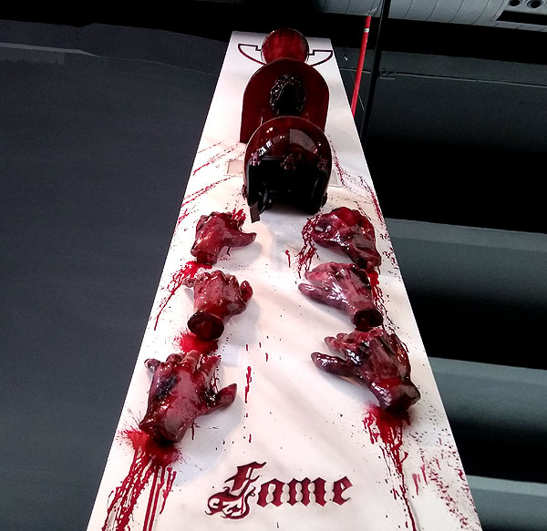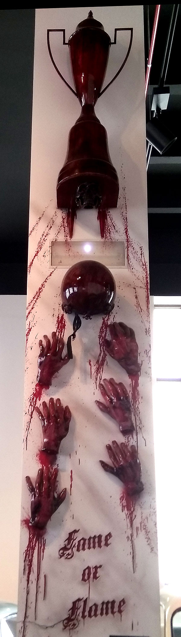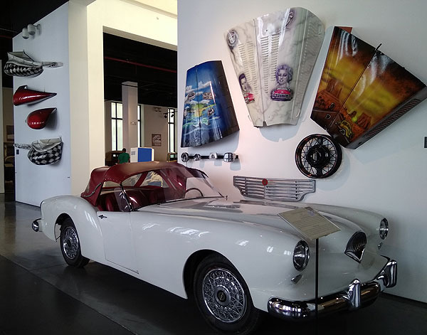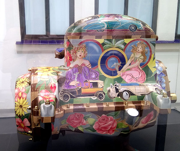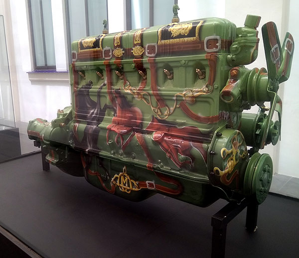 А в музее, кстати, есть еще такой вид автомобильно-модного искусства: делать предметы искусства из деталей автомобиля. Вот выше капоты видно. А есть целый зал расписанных двигателей.
