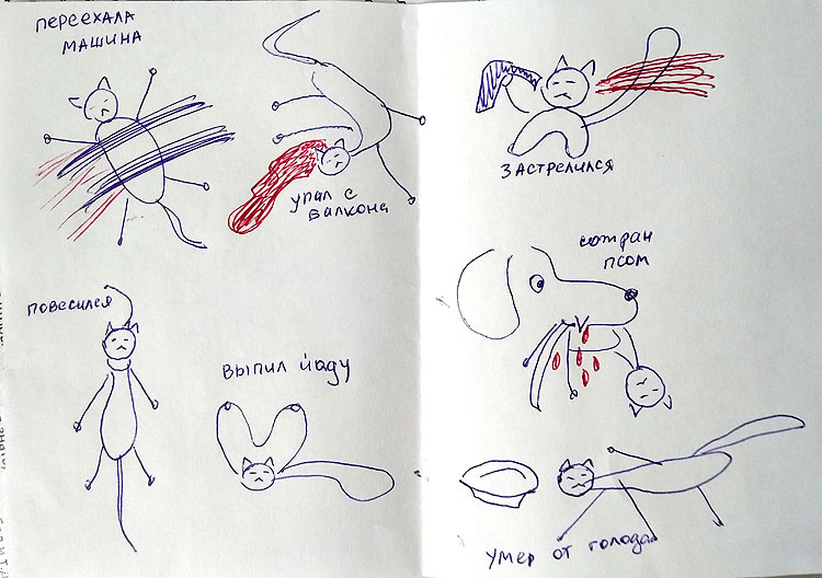 По идее я решила, что все котики будут умирать разной смертью. На картинке подписано (ибо я тот еще художник), а на доске я, конечно, не подписываю, а вслух говорю, от чего котик умер. У меня заготовлено вот эти семь мертвых котиков.