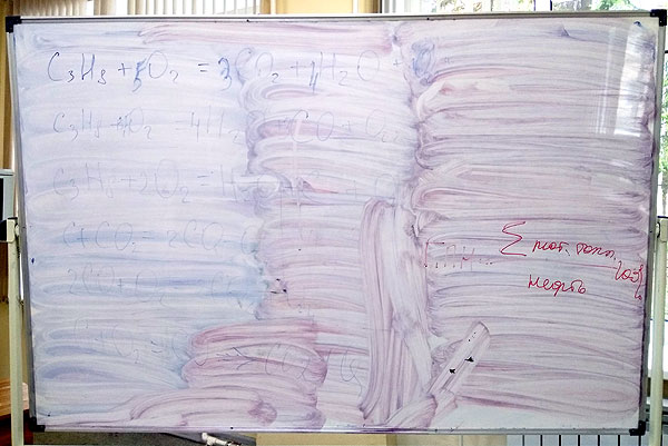 (там много химических формул, написанных сдохшим маркером и немножко красным маркером – это все не стирается).