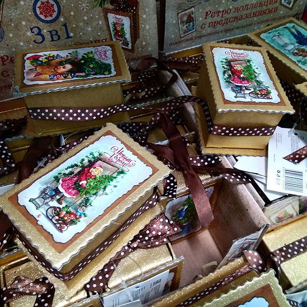 А вот это – какая-то новинка этого года, причем страшно распространенная. Вот такие коробочки с ленточкой. Написано, что внутри будет новогоднее предсказание. Появились одновременно во всех магазинах, а в прошлом году таких не видела.