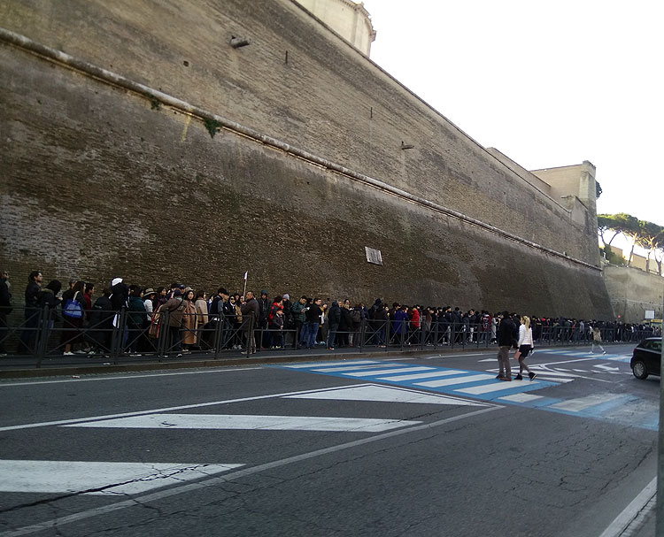 А вот очереди в музеи Ватикана. Это без пятнадцати 9, они еще не открыты. Очередь уходит за угол стены.