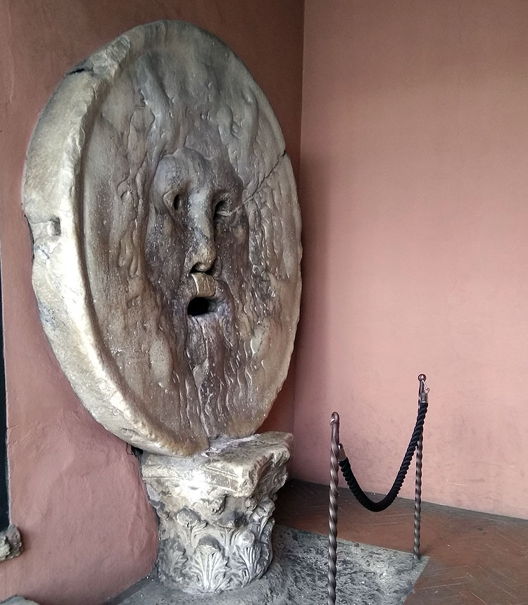 Смысл в следующем: это античная мраморная плита, изображающая бога Океана с открытым ртом. Сделана примерно 2000 лет назад. По преданию, если положить руку ему в рот и сказать неправду, бог откусит тебе руку. И вот стоит очередь туристов, которые фоткаются с рукой во рту этой плиты. Что характерно, при этом ничего не говорят. Для надежности.