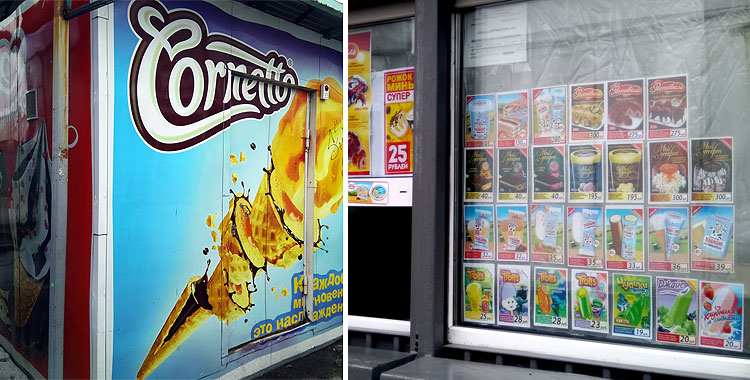 С этой точки зрения, казалось бы, отличным выходом должны быть кафе-мороженые. В кафе-мороженых цены выше, а потому, по идее (по моей идее), они должны предложить нам что-то эдакое. Потому что купить простой пломбир проще и намного дешевле в киоске. Киоски есть в любых концах города.