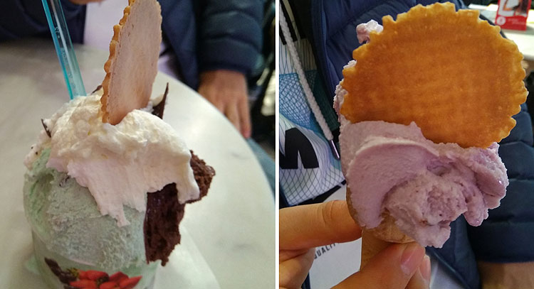 После того, как мороженое уже реально не влезает, тебе предлагают мороженое полить всевозможными соусами (минимум было три: клубника, мята и шоколад), взбитыми сливками и с видом, что творят произведение искусства, втыкают сверху печеньку.