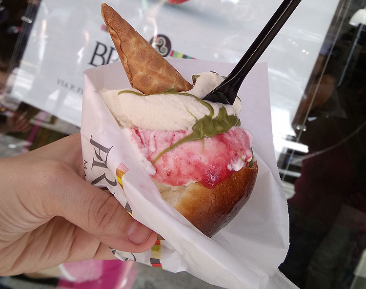В Палермо дело обстоит не хуже! Там твое мороженое так же высокохудожественно, но на этот раз уже с сицилианским темпераментом запихивают в бриошу (сдобную булочку)! И сверху украшают рожком. И опять все это с теми же плясками: мороженое обязательно хорошенько разминают перед выкладыванием, соусами поливают так, как будто это Пикассо пишет очередной шедевр, а втыкают сверху рожок с видом полного удовлетворения процессом.