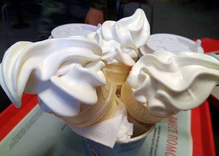 Самое “шоу” из подачи мороженого нам несколько раз показывали в быстро-пите. Например, в Макдо. Паренек, который накладывал мороженое, очень красноречиво беззвучно ругался с автоматом, выписывал очень красивые фигуры руками, чтобы мороженое получилось красивым, потом делал вид, что три рожка держать в руках совершенно невозможно. В итоге составил три рожка в стаканчик для Макфлури с видом, как будто собирает букет роз и галантно преподнес этот букет мимо протянутых Денисиных рук его матери )))