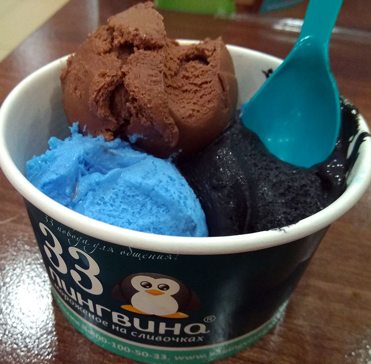 Но все-таки любимое мое кафе-мороженое в Омске – “33 пингвина” (это вообще франшиза, они в разных городах есть, но везде разные, насколько я понимаю; в Омске примерно одинаковые – и это довольно большая сеть, есть много где). На фото, кстати, тоже есть шарик “блю кюрасао”. По фото вам сложно оценить, но давайте я вам просто скажу, что насколько интенсивнее цвет, настолько же интенсивнее и вкус. И это мне в “33 пингвинах” нравится. В шоколадном мороженом – шоколад-шоколад, в манговом – манго-манго, и мороженое космос – тоже просто космос.