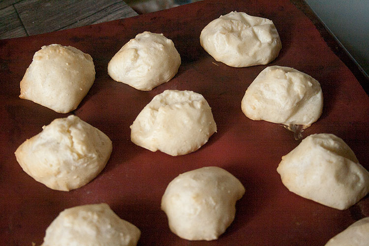 Тесто столовой ложкой выкладываем на смазанный противень (ну, или на силиконовый коврик). Получаем такие типа шарики (но они немного расползаются, конечно). Все тесто не использовать. Оставить около 3 столовых ложек.