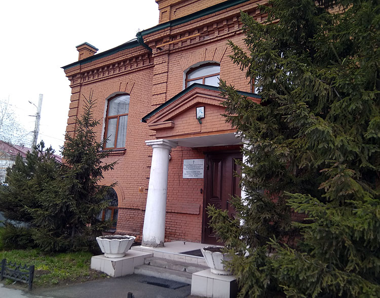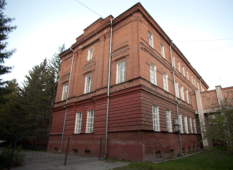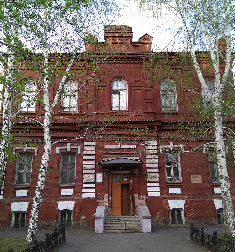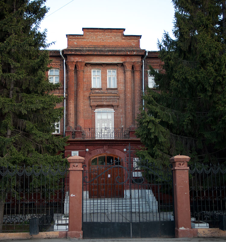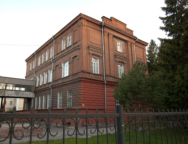 Общего вида на здание нет, потому что оно очень плотно в два ряда засажено высоченными елками. Построено здание в 1909 году. И располагалось здесь женское епархиальное училище. Здание построено по проекту уже упомянутого ранее архитектора Хворинова.