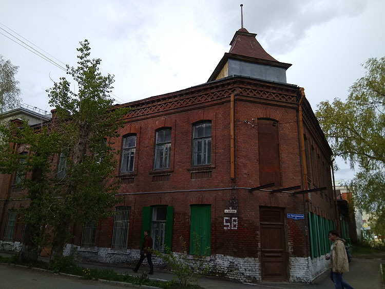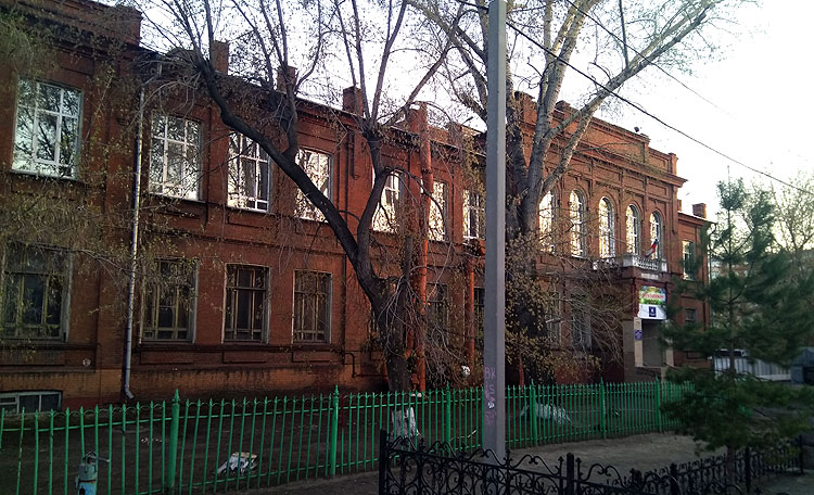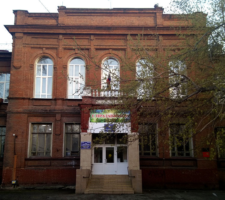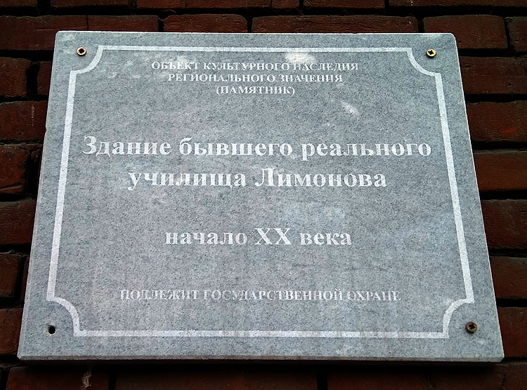 Это здание – доходный дом А.С.Кабалкина. Построено в 1900-х или в 1910-х. Но уже в 1913 здесь располагалось “Реальное училище Лимонова”. Слова “реальное училище” по-современному означают “физико-математическая школа” (среднее учебное заведение с уклоном в математику и естественные науки).