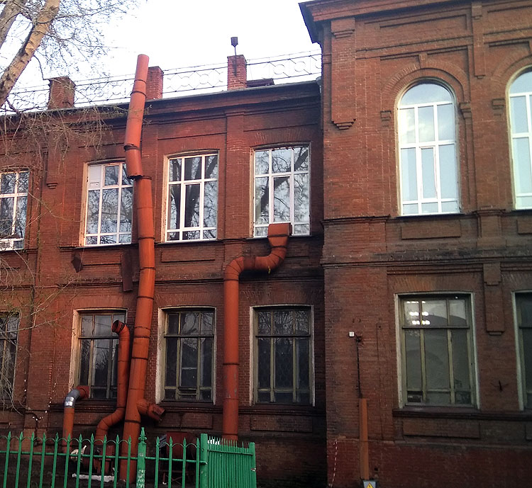Здание большое, но мне почему-то похоже на что-то более индустриальное, чем женская гимназия. Я даже думала, что тут была какая-нибудь фабрика или завод. Вот, например, видите эти трубы? А еще здание со всех сторон огорожено бетонным забором.