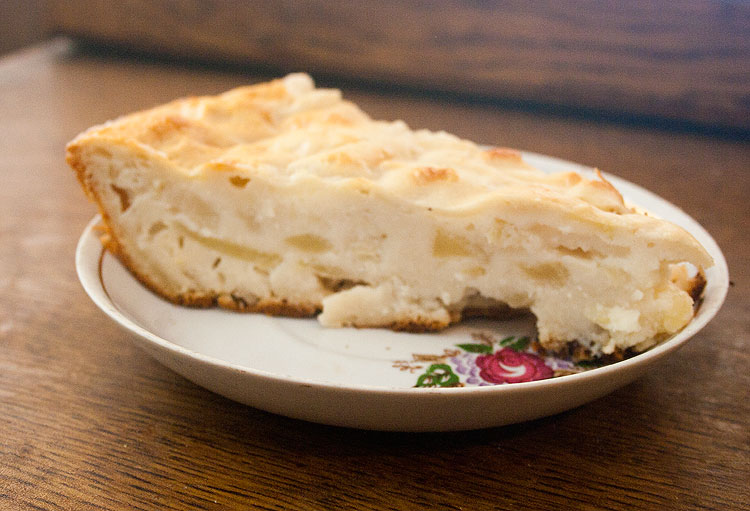 Если яблоки – яблоки почистить (и от семян, и от кожурки), порезать кубиком, тоже перемешать с тестом. В следующий раз попробую от шкурки не очищать – быстрее, а в той же шарлотке нам фрукты обычно не мешаются.
