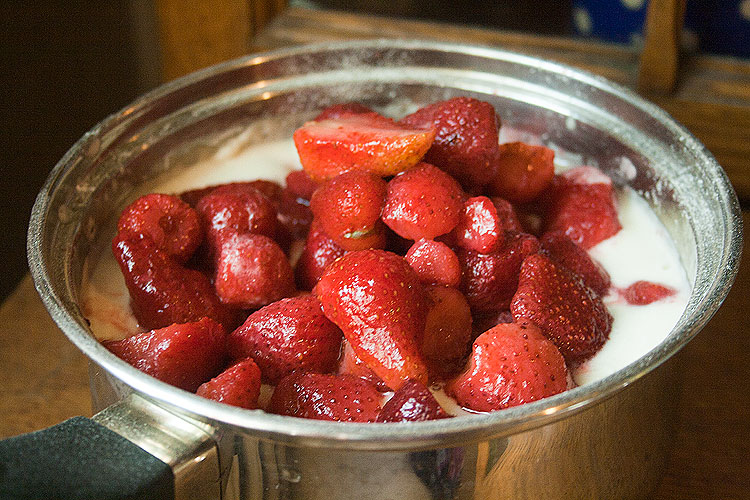А с клубникой – я бы рекомендовала со свежей, а не с замороженной, может быть чуть-чуть с недозревшей, чтобы тверденькой. И порезать пластиками.